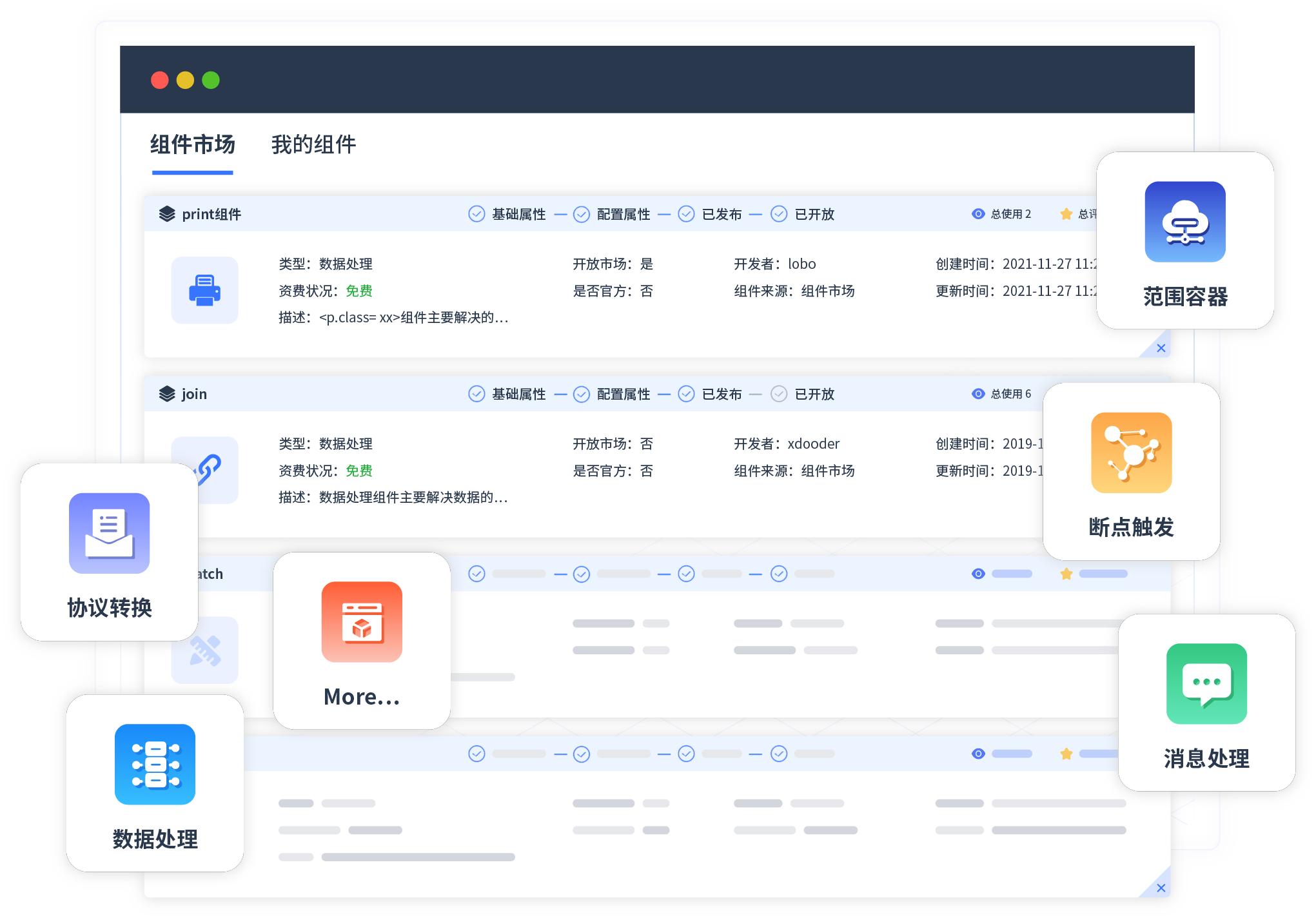 针对集成场景,,华为钱包提供组件市场,,,,例如协议转换、、消息处理、、、、文件操作等。。。。除平台提供的组件外,,客户可以自定义所需组件。。
