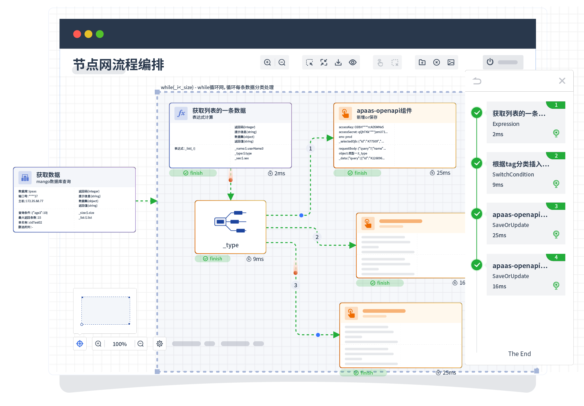 针对集成场景,,,,组件定义后支持进行流程编制,,不同于传统代码方式,,通过图形化展示,,支持在线调试、、、、日志查看和运行回放。。。