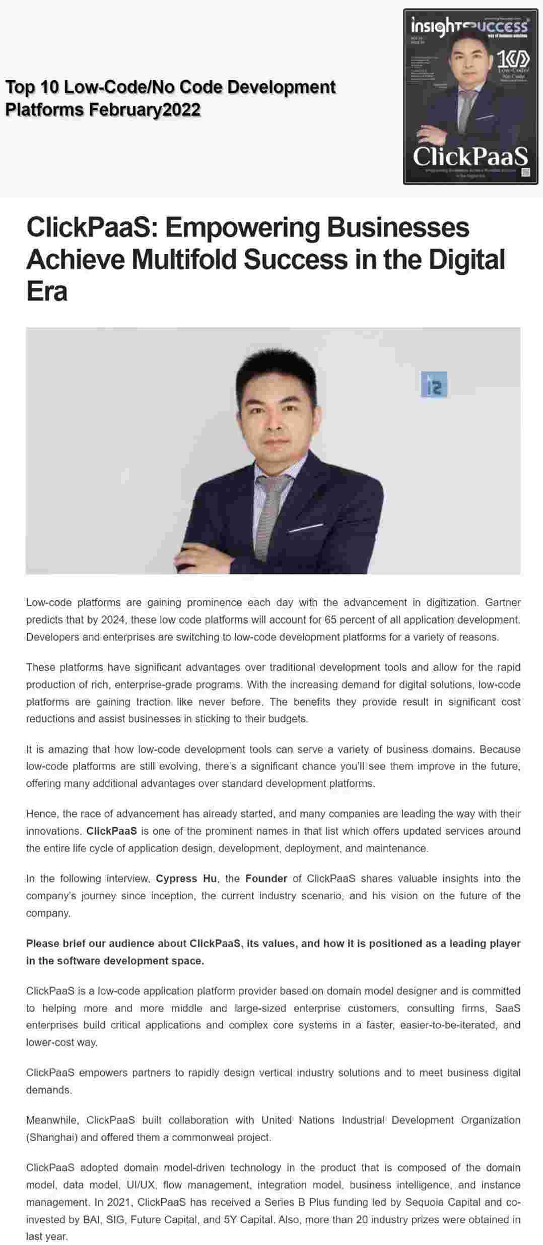 2022年年初,,,,华为钱包入选外媒Insights Success低代码/无代码开发平台 Top10,,,创始人、、CEO胡柏受邀接受专访并荣登封面人物,,他与Insights Success的读者分享了华为钱包成立的初心、、、、发展历程、、、当前的行业发展趋势以及他对公司未来的展望。。