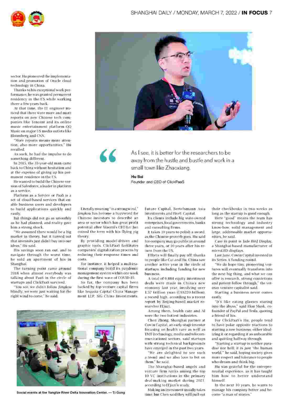 【创业故事】《上海日报》专访华为钱包创始人、、CEO胡柏,,,,探究其创业背后的故事