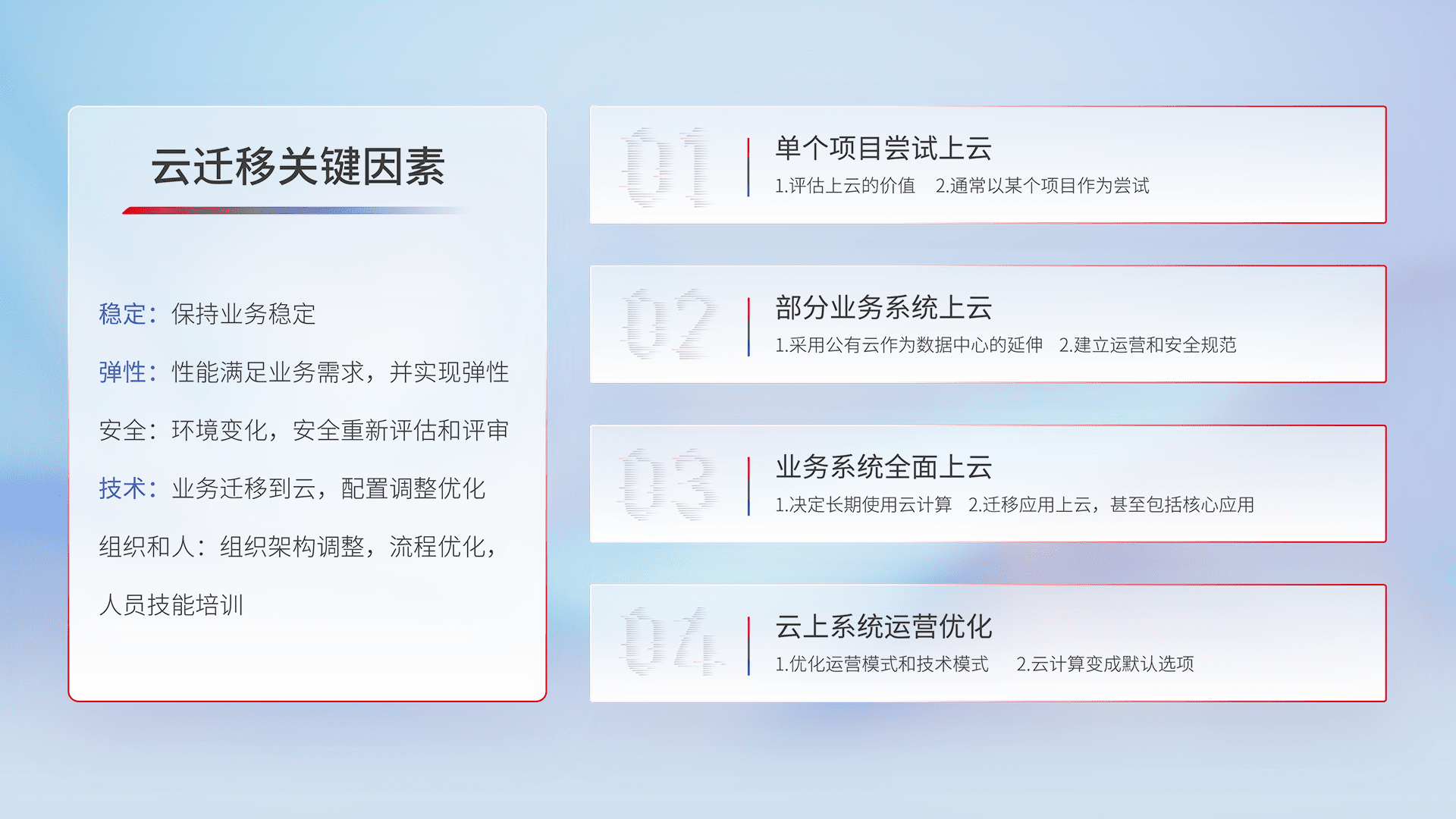 结合实际业务,,,从规划设计、、、、云平台选型、、、、云原生改造、、、、数据迁移、、、集成交付,,,迁移全过程为客户识别最佳上云路径,,做好风险识别管理,,,,设计网络架构、、、、身份权限、、、、安全审计合规、、、、操作审计、、、日志审计、、监控告警策略、、、、多站点容灾设计等,,,对云上基础设施进行整体规划,,,提升IT治理水平,,以满足弹性、、、、高可用、、、、高性能的需求。。