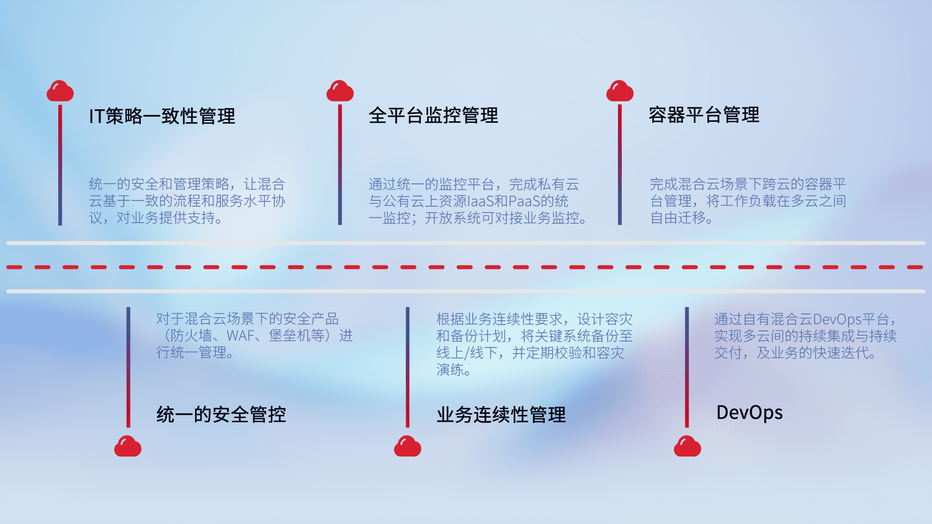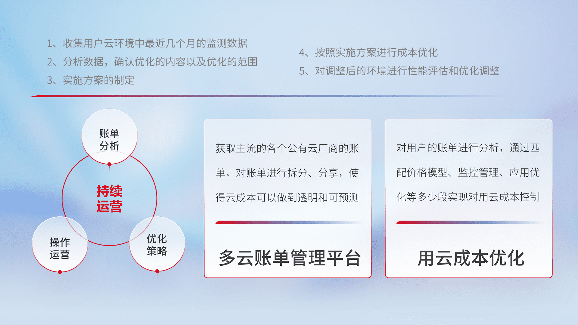 通过多云纳管,,,,以统一的资源数据模型把客户的云资源进行抽象和封装,,进而实现对多云资源的统一操作,,,保障云资源管理的可靠性、、稳定性与可用性。。。。量身定制化运维内容,,配置、、、、开发运维、、、补丁管理、、、备份、、、监控、、认证和访问管理、、、、审计和日常巡检等,,,,保障在用云过程中的可靠度,,,稳定度以及高可用率。。。。
